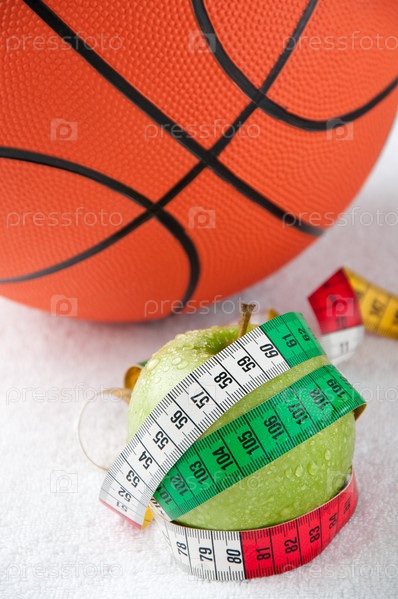 Свежее яблоко с сантиметровой лентой и баскетбольный мяч