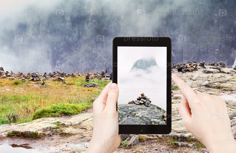 Человек фотографирует каменные пирамиды в Норвегии