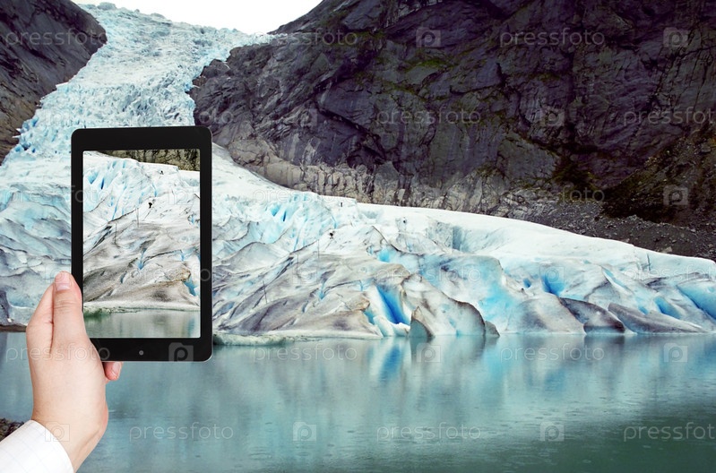 Человек фотографирует ледник в Норвегии