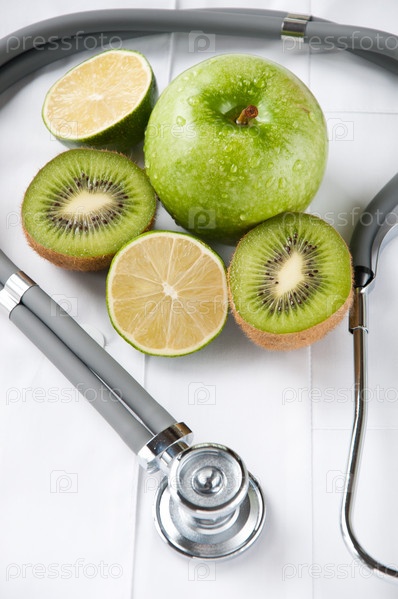 Свежие яблоко, лаймы и киви лежат на медицинском халате со стетоскопом