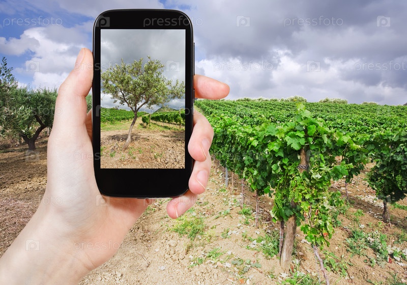 Человек фотографирует оливковый сад, Италия