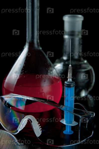 Лабораторные колбы, шприц и защитные очки на черном фоне