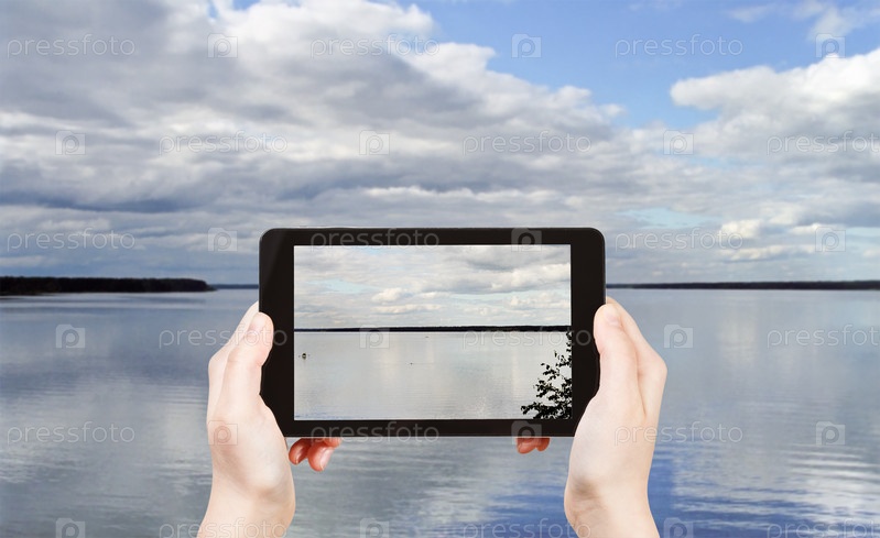Человек фотографирует озеро Селигер, Россия