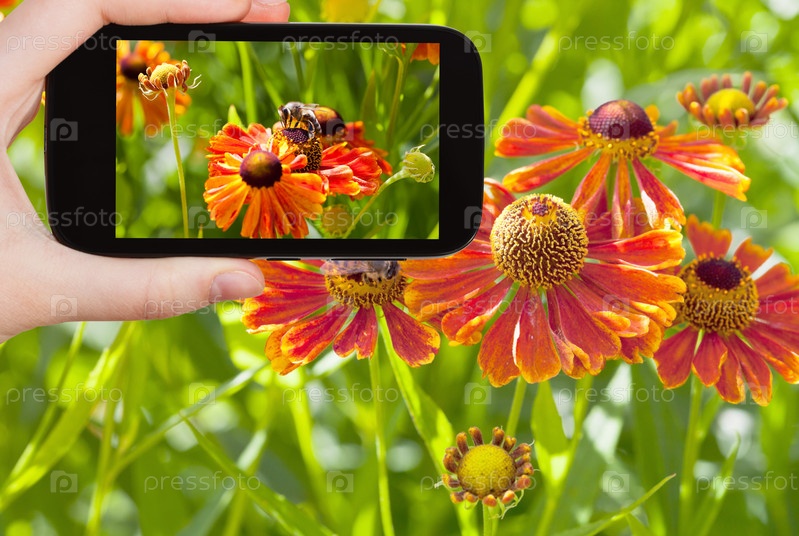 Человек фотографирует пчелу на цветке