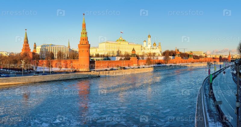 Панорама Московского Кремля на закате со стороны реки, Москва, Россия