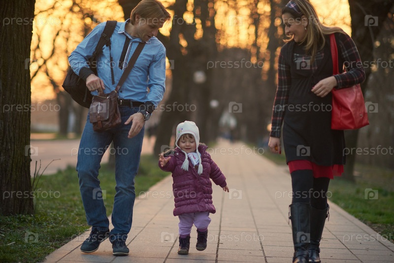 Семья с ребенком гуляют на улице