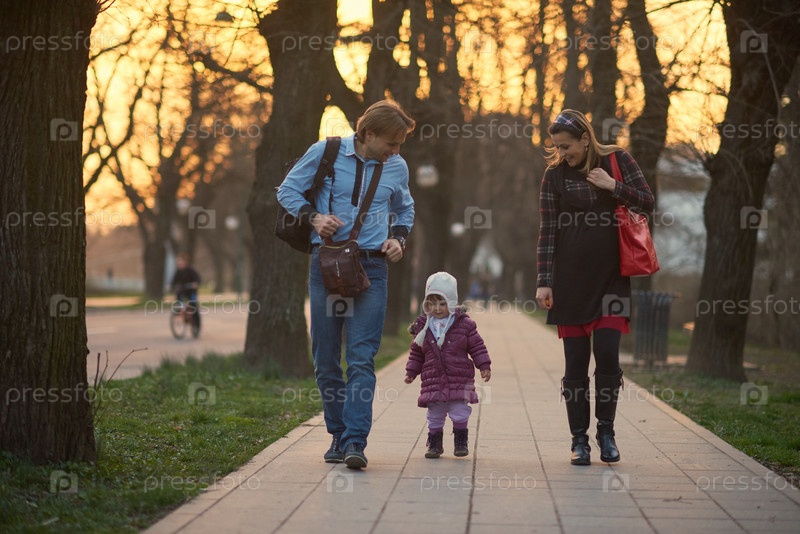 Семья с ребенком гуляют на улице
