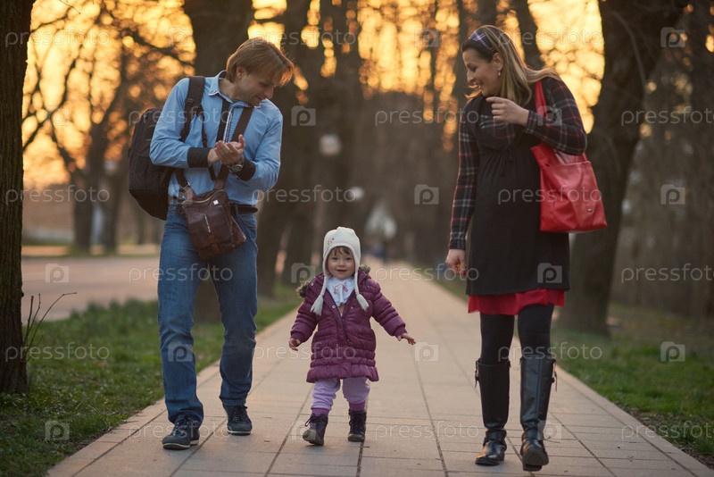 Семья с ребенком гуляют на улице