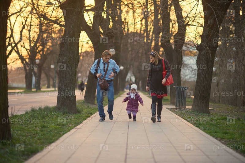 Семья с ребенком гуляют на улице
