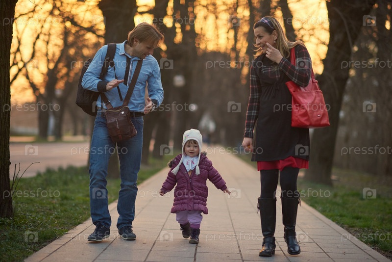 Семья с ребенком гуляют на улице