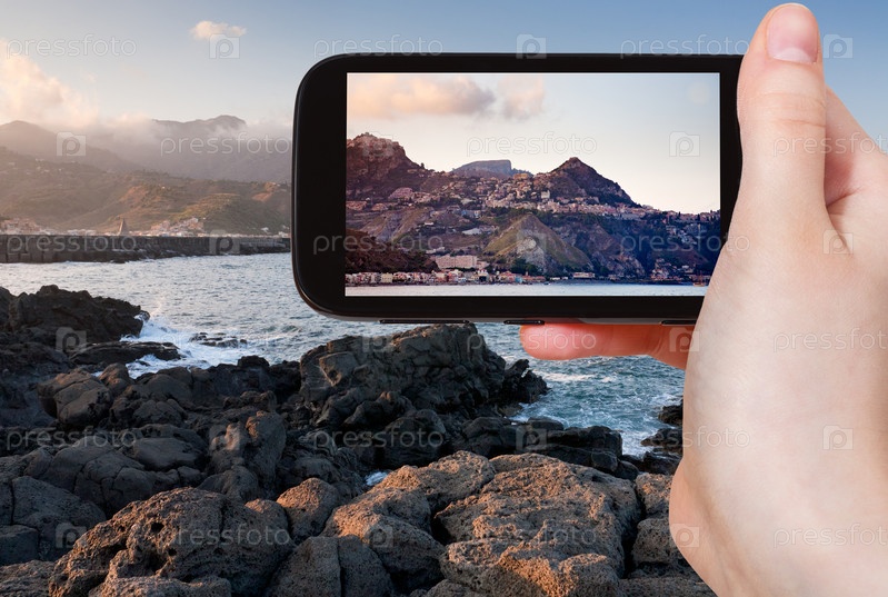 Человек фотографирует город Таормина на закате
