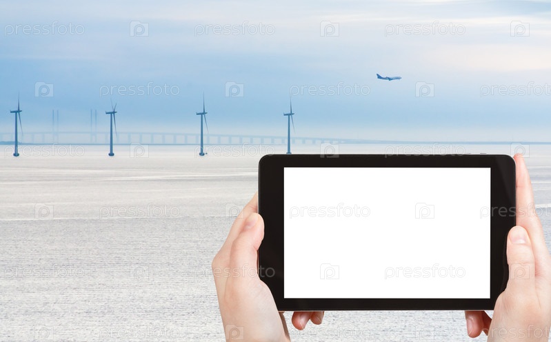 Человек фотографирует ветряки и Эресуннский мост