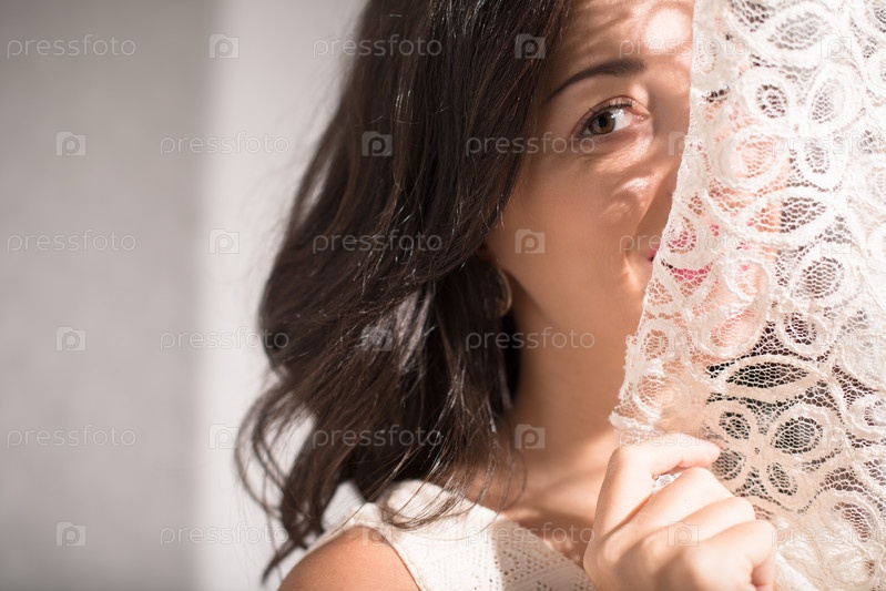 Женщина прячется за шторой