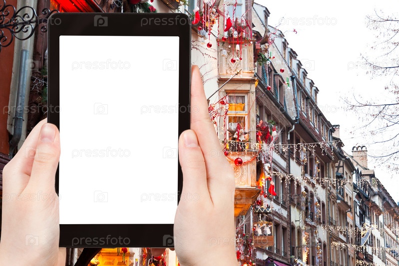 Турист фотографирует дома с рождественским декором