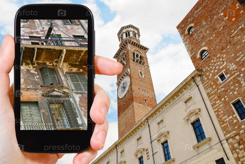 Турист фотографирует старые дома в городе Верона