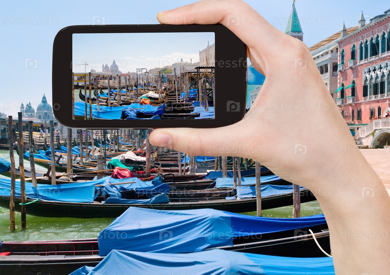 Турист фотографирует гондолы возле площади Сан-Марко