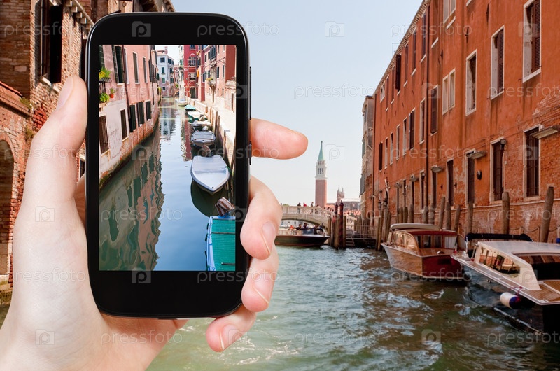 Турист фотографирует гондолы