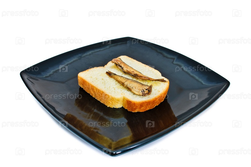 Хлеб со шпротами на черной тарелке. Изолированные на белом фоне