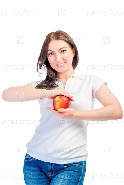 Счастливая девушка и яблоко в ее руках