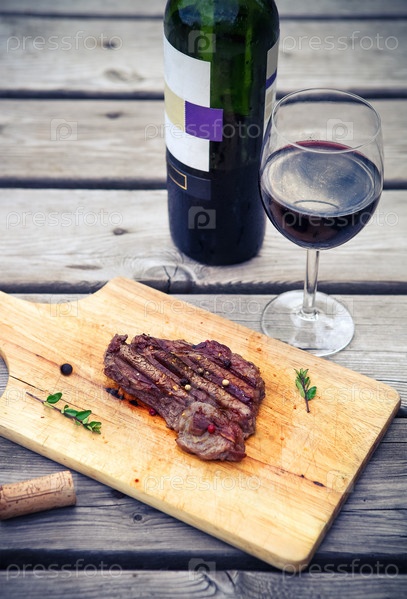 Стейк барбекю. Барбекю на гриле стейк из говядины с красным вином