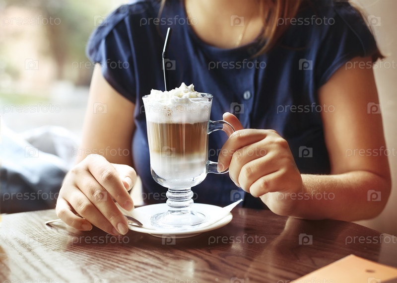 Молодая женщина, сидя в кафе с чашечкой кофе латте