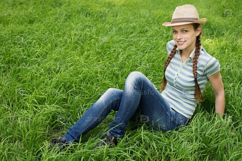 Молодая девушка, сидящая на траве