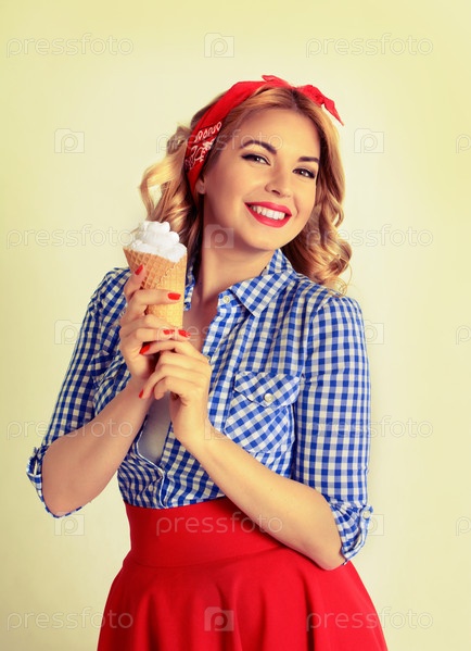 Счастливая женщина, едят мороженое, изолированные на белом фоне