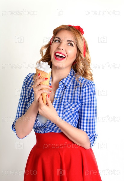 Счастливая женщина, едят мороженое, изолированные на белом фоне