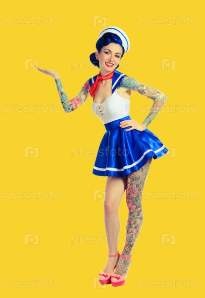 Очаровательная девушка матрос к его полной высоты, рука показывает показательные жест