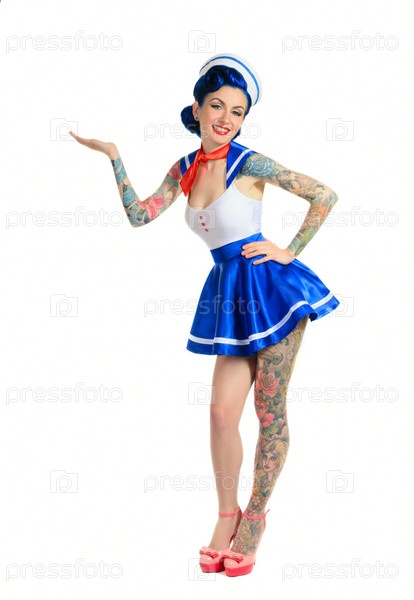 Очаровательная девушка матрос к его полной высоты, рука показывает показательные жест