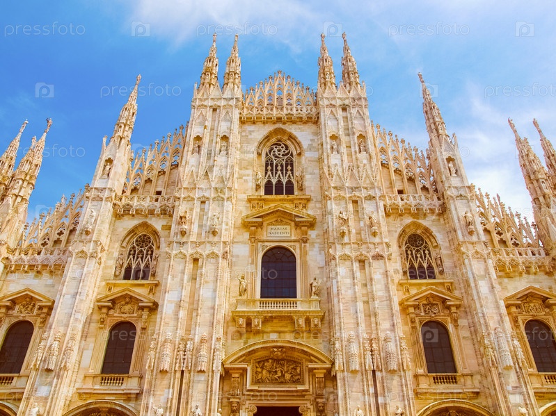 Винтаж Глядя Дуомо ди Милано, смысл Миланский собор в Италии, с голубым небом