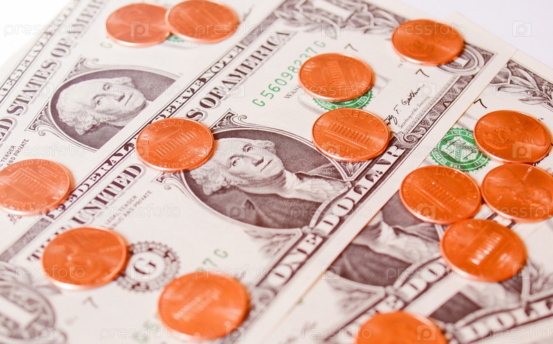 Винтаж Глядя один цент монеты и банкноты валюта один доллар Соединенных Штатов, полезны в качестве фона