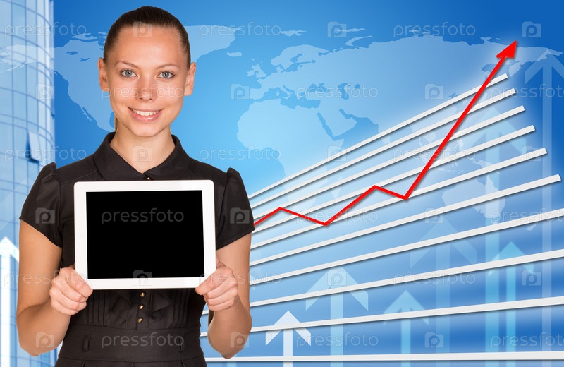 Улыбаяющаяся молодая женщина, держащая планшет