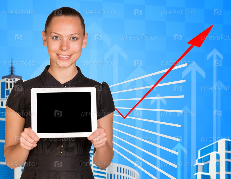 Улыбаяющаяся молодая женщина, держащая планшет