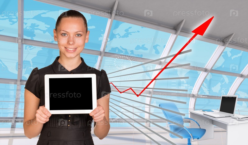 Улыбаяющаяся молодая женщина, держащая планшет
