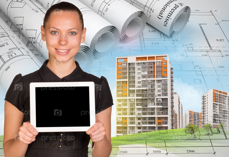 Улыбаяющаяся молодая женщина, держащая планшет