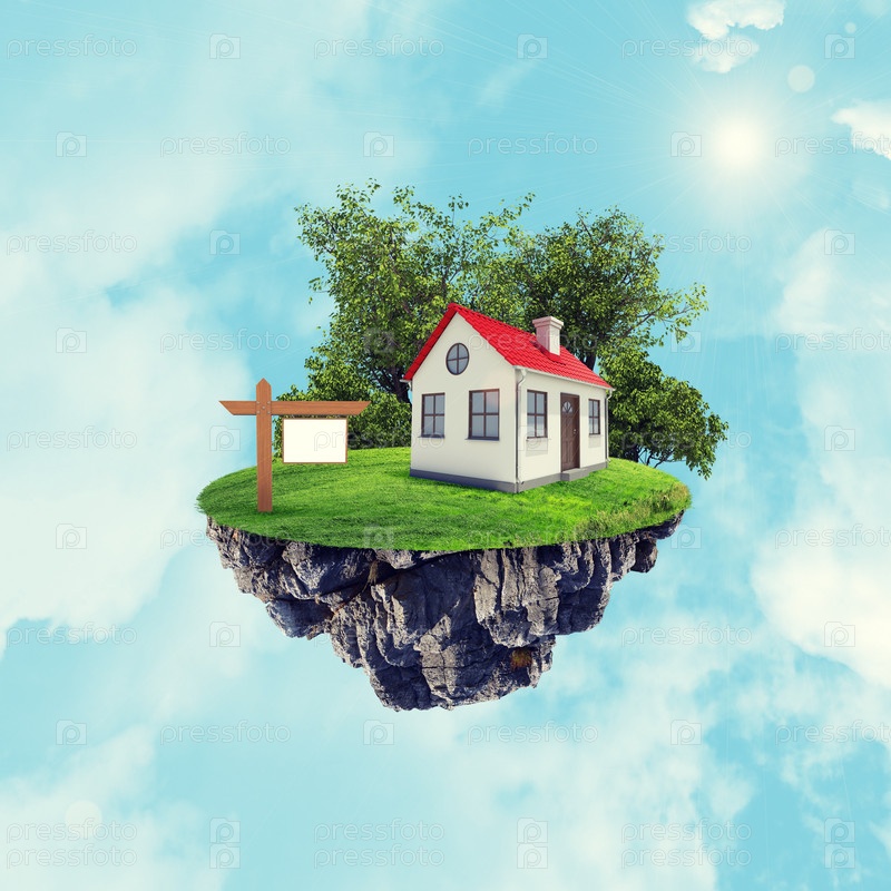 Белый дом с красной крышей и подписать на острове в небо с облаками
