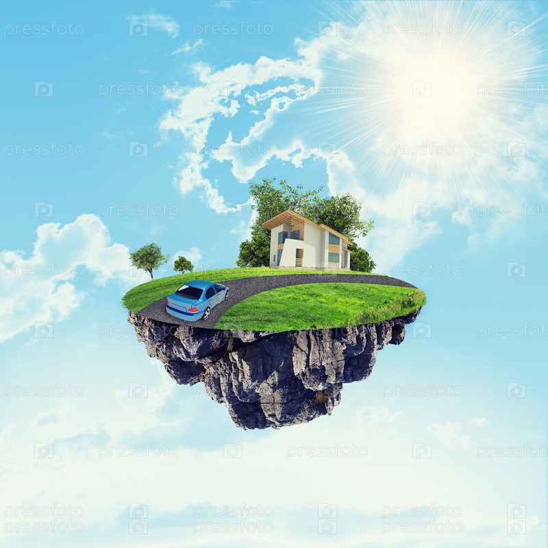 Белый дом с коричневой крышей, дороги и автомобилей на острове в небе облачно и солнечно