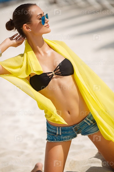 Девушка в желтом парео на пляже
