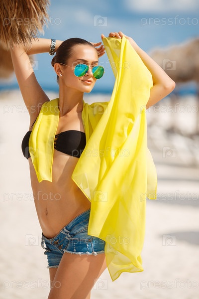Девушка в желтом парео на пляже