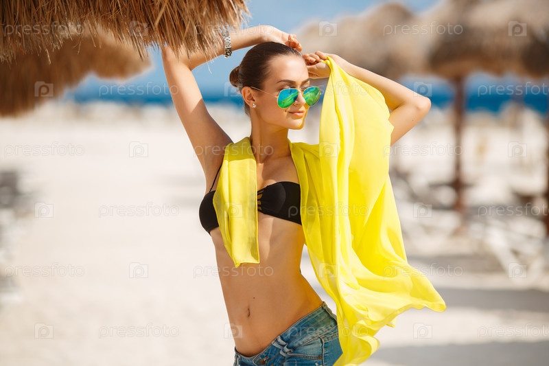 Девушка в желтом парео на пляже