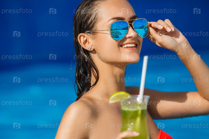Девушка в оранжевом купальнике у бассеина