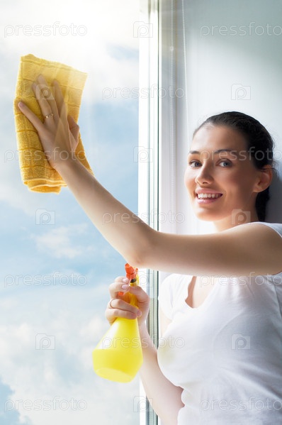 Молодая женщина моет окна