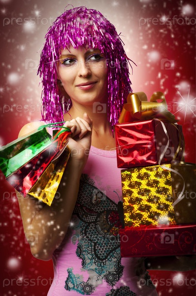 Девушка в ярком парике и с подарками в руках