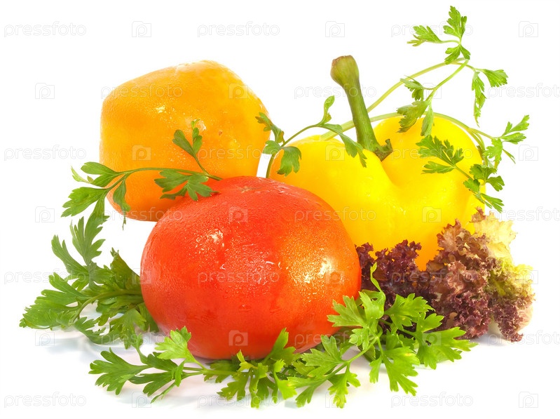 Перец, помидоры и зелень на белом фоне
