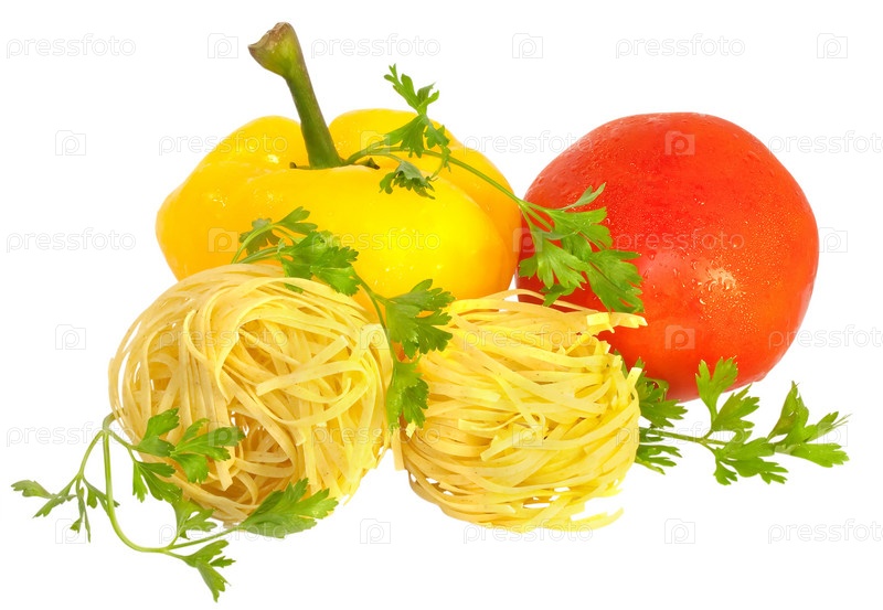 Макароны феттучини, помидор, перец и петрушка на белом фоне