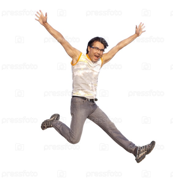 Счастливый молодой человек прыгает на белом фоне