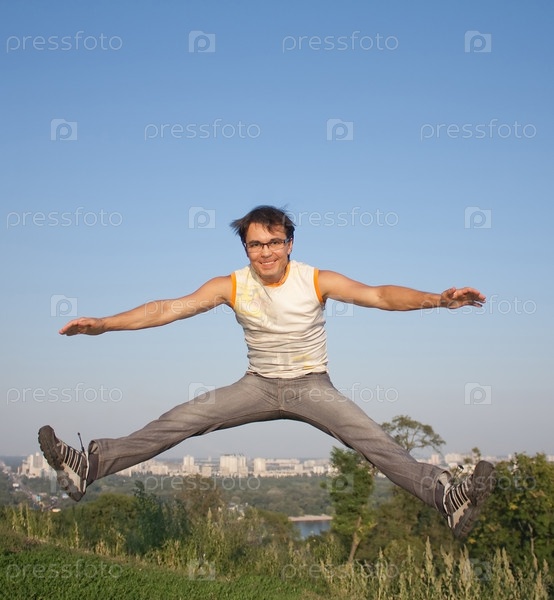 Счастливый молодой человек прыгает на траве на фоне города
