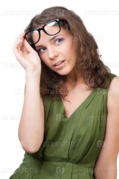 Красивая молодая девушка смотрит в сторону, приподняв очки, на белом фоне