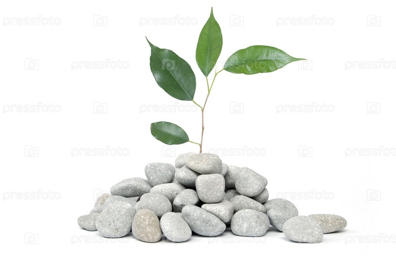 Горсть камней и росток с зелеными листьями на белом фоне